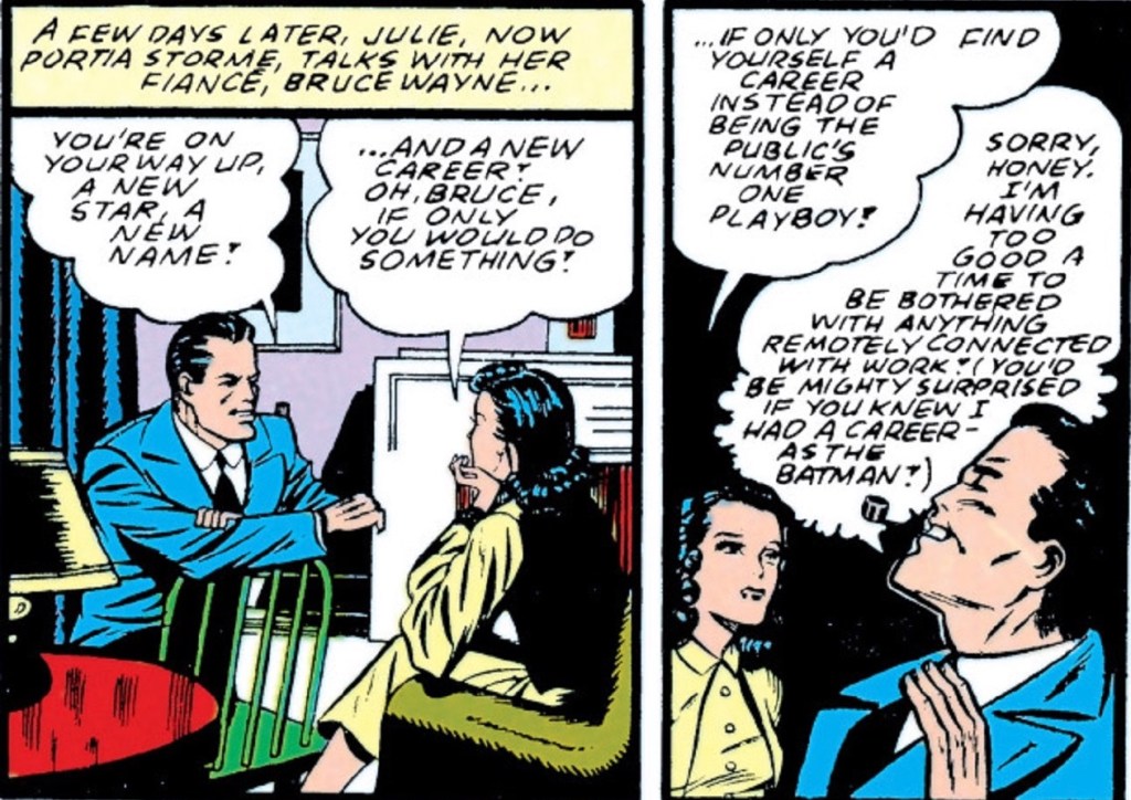 This was the mean average function of women in the pre-code Batman comics – foils for Bruce Wayne’s cover as a playboy yet never serious romances who endanger his nighttime career as the Batman. Boys would read the women in Bruce’s life like public appearances and homework – aspects of societal normalcy that get tossed aside once crime-fighting calls.